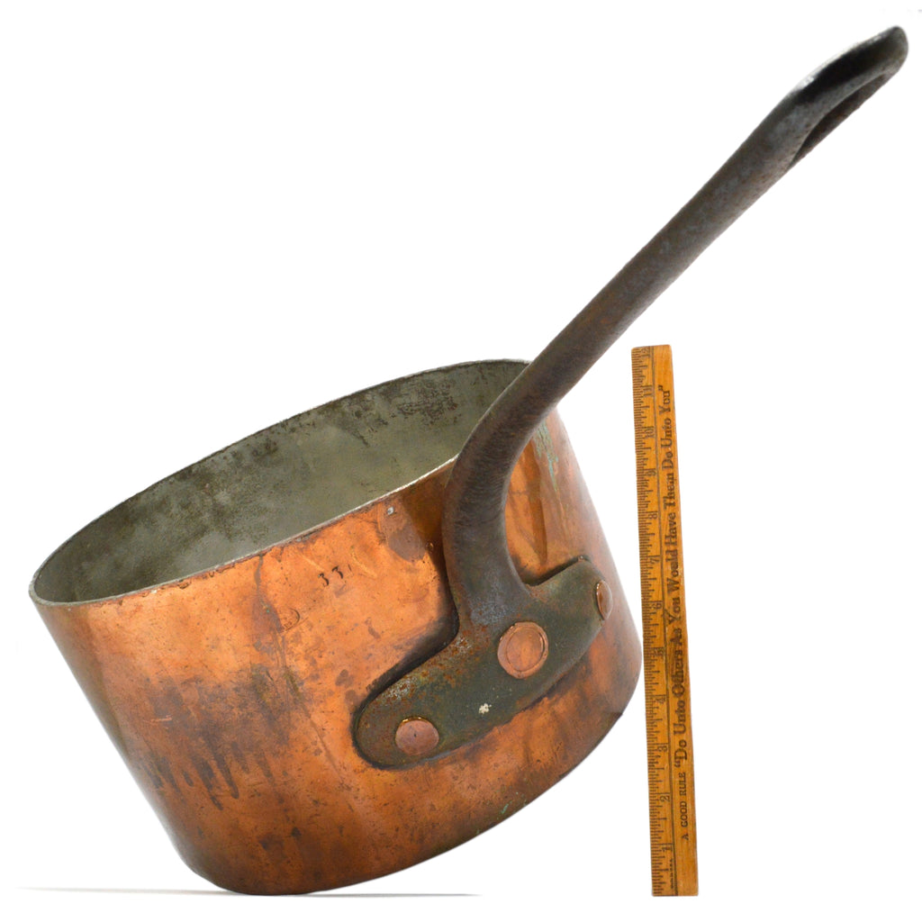 Two sizable repairs at base/bottom rim (see last 6 pics - best visible in the very last 3). We are not experts at assessing copper repairs but they look to be very well done to us. Holds water - NO leaks. Handle remains incredibly strong. Does not sit perfectly flat (but pretty close - just an approximately 1/8" wobble side to side). Sharpie marker handwriting at base (see last 2 pics - possibly by repair company?). Otherwise, moderate -to- severe cosmetic blemishes throughout. Features outstanding, rich patina throughout. All-in-all, an awesome example of an especially rare & special, old Gaillard Paris copper pot! See pics.