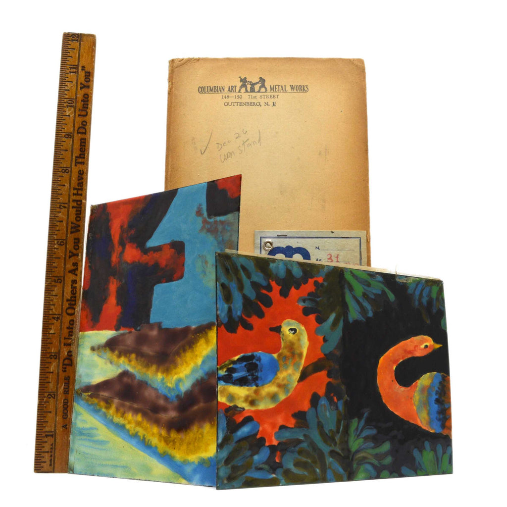 Being offered for sale is the lot of 2 (as we found them together) rare & unusual (zero info found online about these) antique PAINTED METAL TILES/PANELS in ORIGINAL CARDBOARD (we don't actually know what it is/what use it is intended for - thinking it could be a salesman's sample of some sort) by "COLUMBIAN ART METAL WORKS" of Guttenberg, N.J. from circa the early 20th century (best guess), as seen in the pictures/as described in the title. PLEASE SEE BELOW FOR IMPORTANT CONDITION NOTES. Being offered for sale as-found, uncleaned. May require a thorough detailing to bring to its full potential.