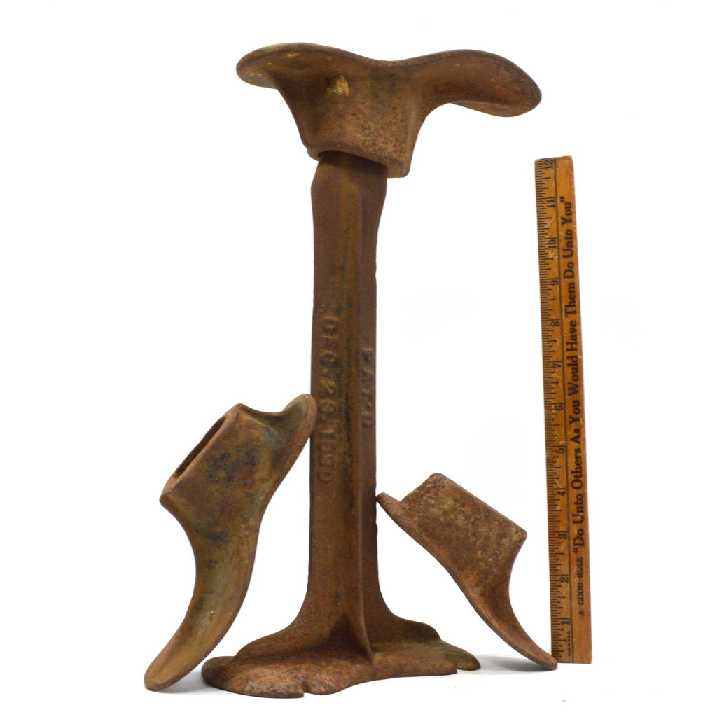 Antique CAST IRON COBBLER'S ANVIL SET Embossed Stand + 3 SHOES "PAT DEC 23 1890"