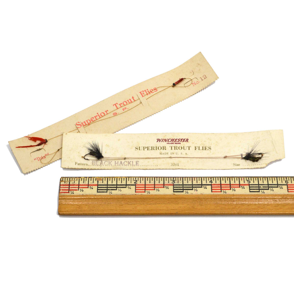 Being offered for sale is the lot of 2 antique "SUPERIOR TROUT FLIES" (1 "Ibis" No. 12 by "S.P." and 1 "BLACK HACKLE" by "WINCHESTER" marked "3201"), BOTH ON ORIGINAL CARD-BACKS, from circa the early 20th century (best guess), as seen in the pictures/as described in the title. PLEASE SEE BELOW FOR IMPORTANT CONDITION NOTES. Being offered for sale as-found, uncleaned. May require a thorough detailing to bring to its full potential.