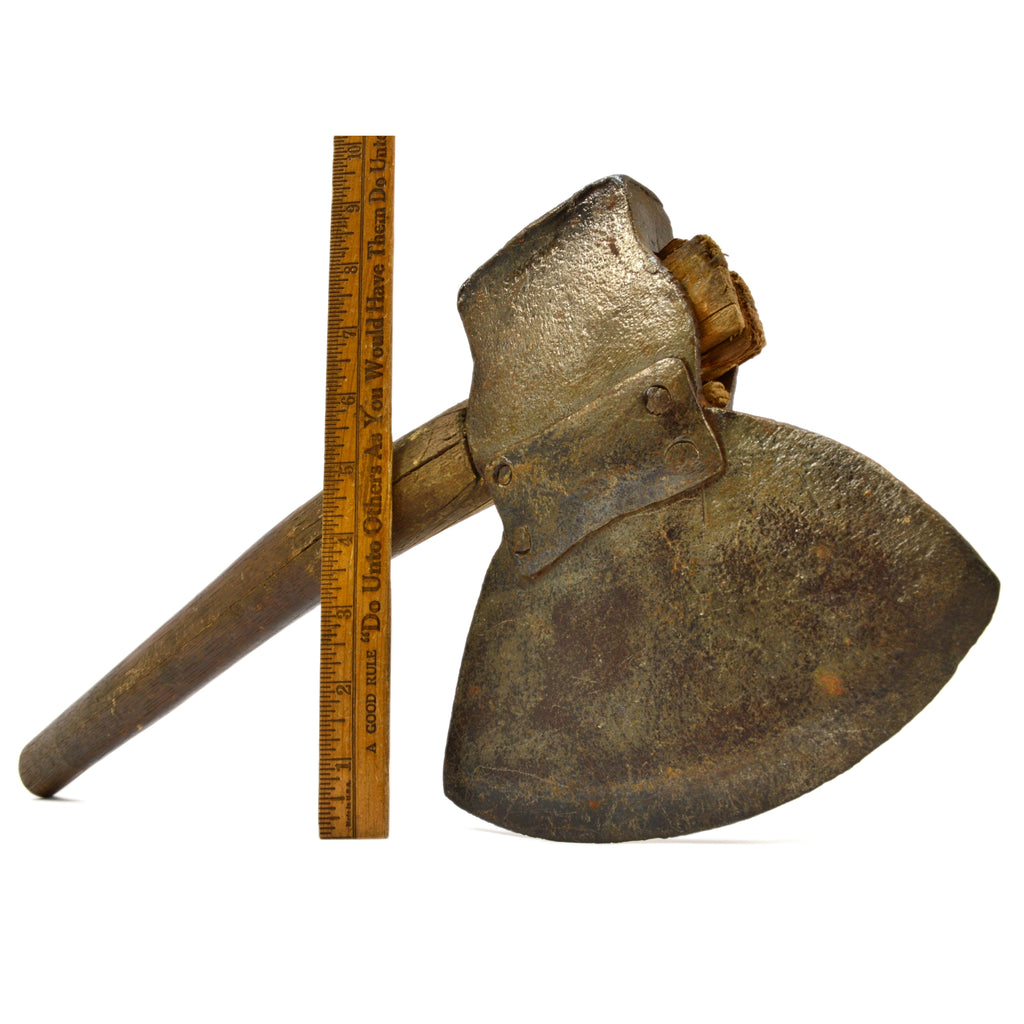 Repaired with a unique & very strong steel plate patch secured with (4) thru-bolts. Otherwise, Good/G+ antique condition with moderate overall wear from normal use over the years. Minimal rust but moderate pitting throughout. Blade has many tiny nicks along entire length but nothing too bad and remains quite sharp. Handle is either original or a very old replacement and remains structurally solid & strong (despite the splits at each side, near head - see pics) with head firmly attached. Clearly stamped "J. HICKS" at each side of head. Awesome broad axe by a very rare tool maker!! See pics.