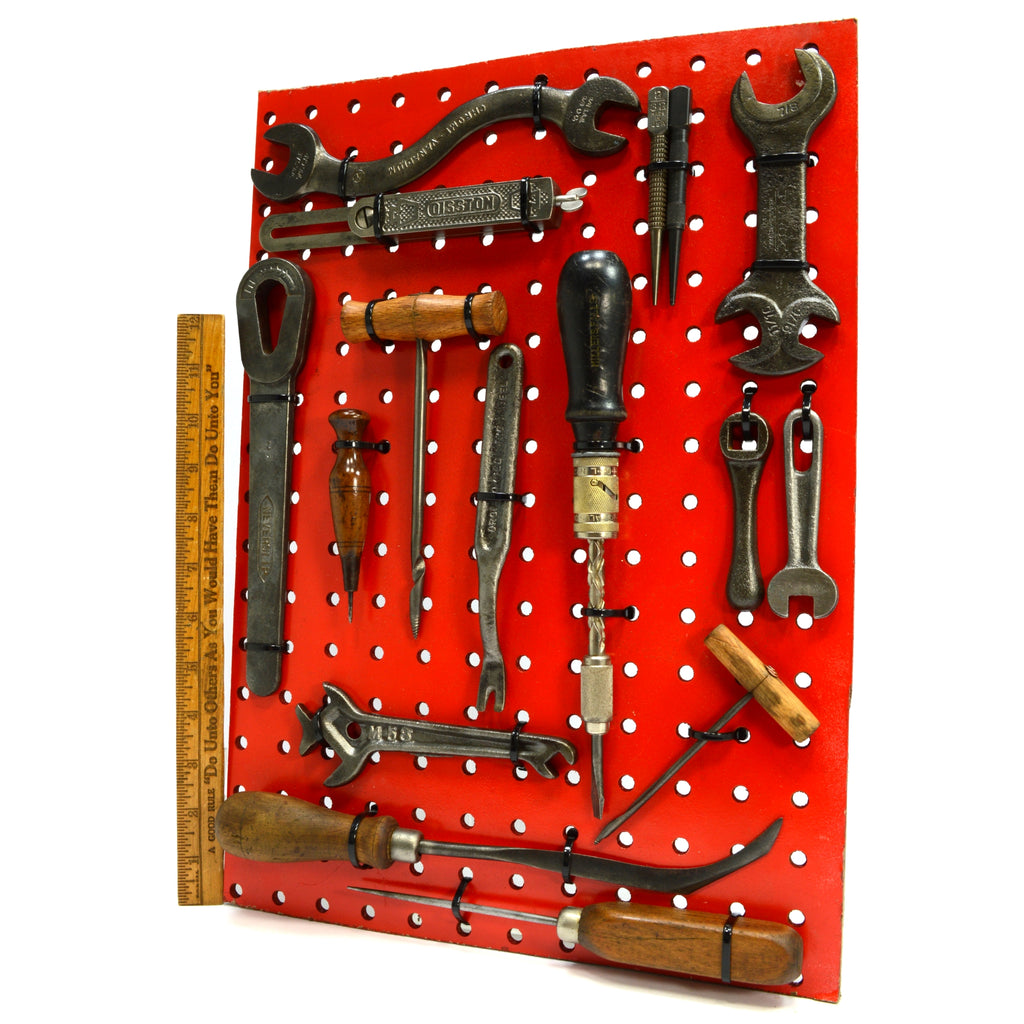 All tools are in Very Good/VG+ or better, lightly cleaned/restored condition. NONE have any breaks or repairs. ALL are fully functional tools (if you choose to removed them from peg board). NO wall mounting hardware installed or included. See pics.
