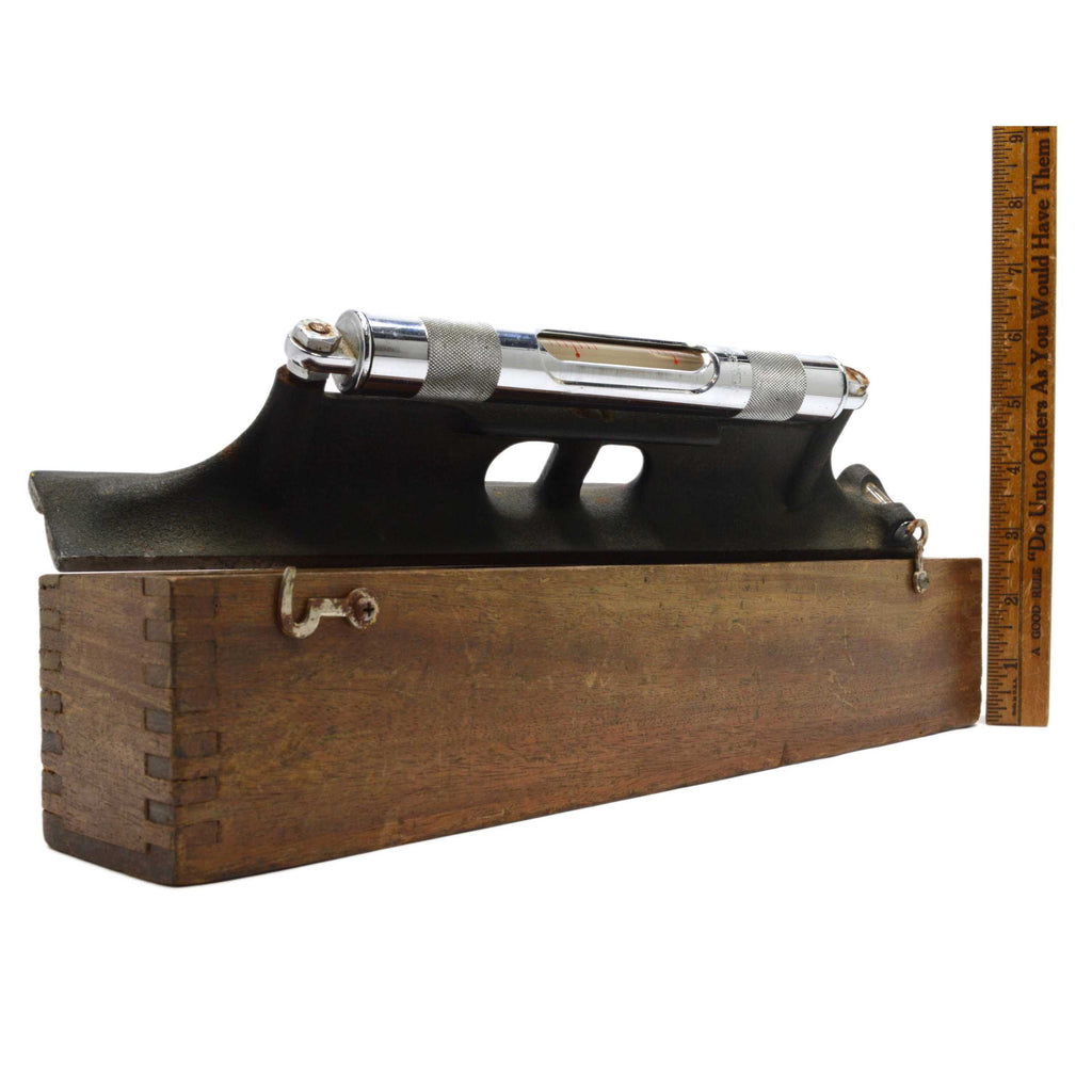 Very Good/VG++ vintage/gently used condition with just few & minor/very small cosmetic blemishes and areas of light/moderate rust throughout (see pics) but we see NO breaks or repairs. Fully functional tool. Original wooden box is missing lid/top half and (1) of the hinges. Otherwise, it is in good shape and remains structurally rigid & strong. Fantastic patina to both level & box throughout. See pics.