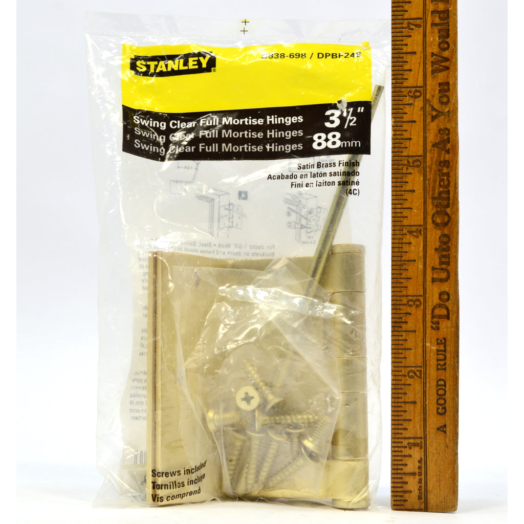 Being offered for sale is the brand new STANLEY "SWING CLEAR FULL MORTISE HINGES" (included is (1) 3-1/2" (88mm) hinge with rod & screws) with "SATIN BRASS" finish, No. S838-698 / DPBF248, factory sealed new-old-stock from 2009, as seen in the pictures/as described in the title. PLEASE SEE BELOW FOR IMPORTANT CONDITION NOTES. SATISFACTION GUARANTEED or your money back...no questions asked!