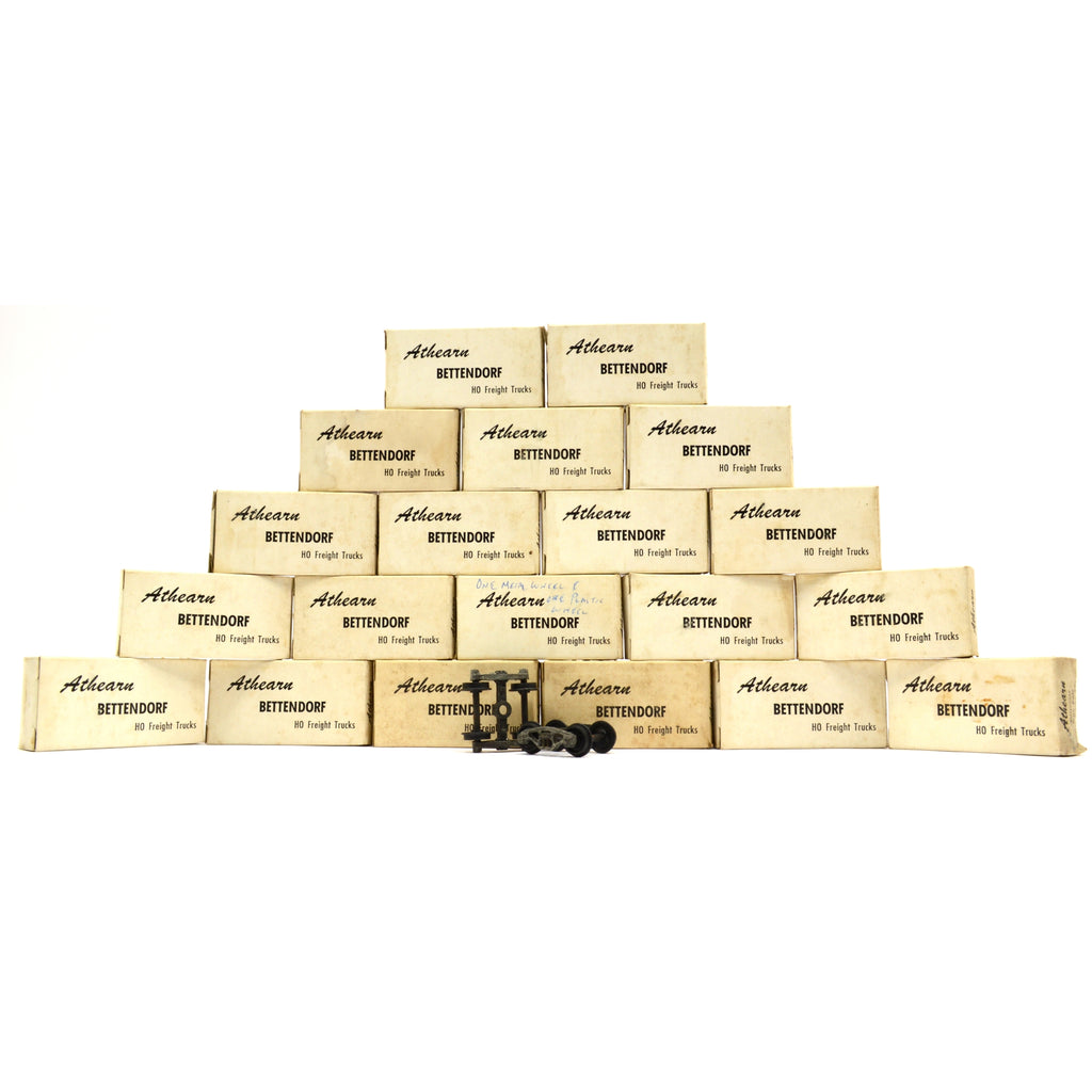 Being offered for sale is the lot of 20 pairs (included are 11 pairs of metal trucks, 8 pairs of plastic trucks and 1 mixed pair of 1-metal truck & 1-plastic truck) of NEW OLD STOCK vintage HO FREIGHT TRAIN TRUCKS by ATHEARN BETTENDORF from circa the mid 20th century (best guess), as seen in the pictures/as described in the title. PLEASE SEE BELOW FOR IMPORTANT CONDITION NOTES. Being offered for sale AS-FOUND, uncleaned. May require a thorough detailing to bring to their full potential. SATISFACTION GUARANTEED or your money back...no questions asked!