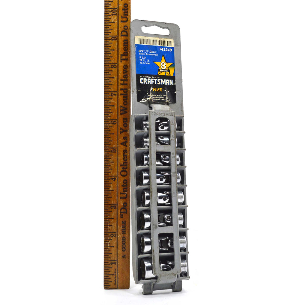 Being offered for sale is the lot/set of 8 briefly used CRAFTSMAN No. 9-43249 "FLEX" / SWIVEL SOCKETS (1/4" drive, 6 point, sizes included; 5 mm, 6mm, 8 mm, 10 mm, 11 mm, 12 mm, 13 mm & 14 mm) on/in original plastic rack/packaging, as seen in the pictures/as described in the title. Please see below for condition notes. Being offered for sale AS-FOUND, uncleaned. May require a thorough detailing to bring to its full potential.