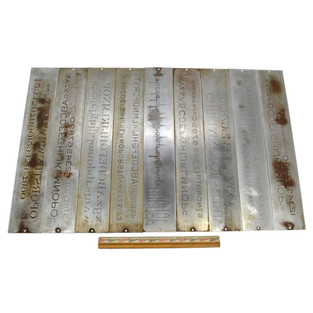 Being offered for sale is the lot of 9 antique "MASTERPLATE" ENGRAVING FONT/ALPHABET & NUMBER PLATES/TEMPLATES for use with ENGRAVER and/or PANTOGRAPH MACHINE(S), by "CRONITE COMPANY" (some are marked, others may or may not be - some may or may not be by additional maker(s)) of North Bergen, N.J., from circa the early 20th century (best educated guess), as seen in the pictures/as described in the title. PLEASE SEE BELOW FOR IMPORTANT CONDITION NOTES. Being offered for sale AS-FOUND, uncleaned. May require a thorough detailing to bring to its full potential.