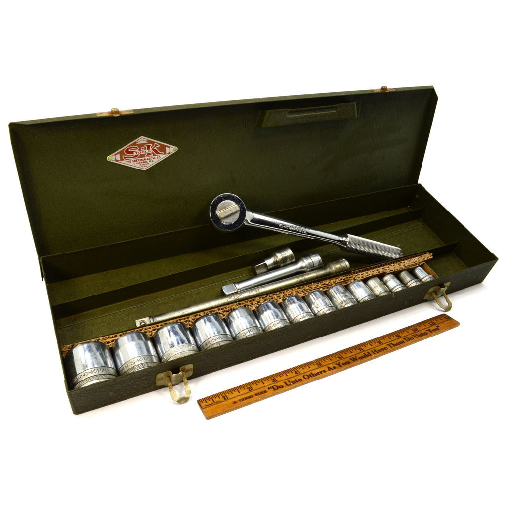 Being offered for sale is the vintage SHERMAN-KLOVE CO. (S-K) SOCKET SET (18 Pieces, 1/2" Drive, 12-Point, Socket sizes 7/16" thru 1-1/4" (see pics)) in ORIGINAL METAL CASE, from circa the mid -to- late 20th century (best guess), as seen in the pictures/as described in the title. PLEASE SEE BELOW FOR CONDITION NOTES. Being offered for sale AS-FOUND, uncleaned. May require a thorough detailing to bring to its full potential. SATISFACTION GUARANTEED or your money back...no questions asked!